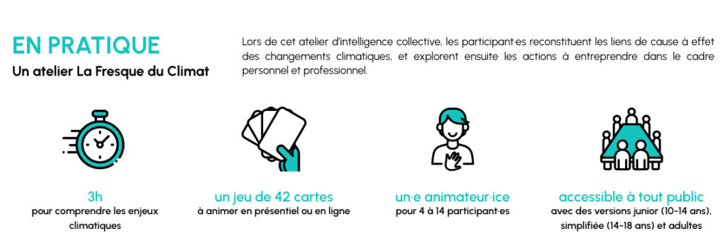 Animé par la communauté de fresqueurs et fresqueuses, l’atelier mise sur l’intelligence collective et permet de comprendre les causes et conséquences des changements climatiques en 3 h. L’outil repose sur un jeu de 42 cartes, traduites dans plus de 45 langues, dont le contenu est issu des rapports scientifiques du GIEC (groupe d’experts intergouvernemental sur l’évolution du climat).